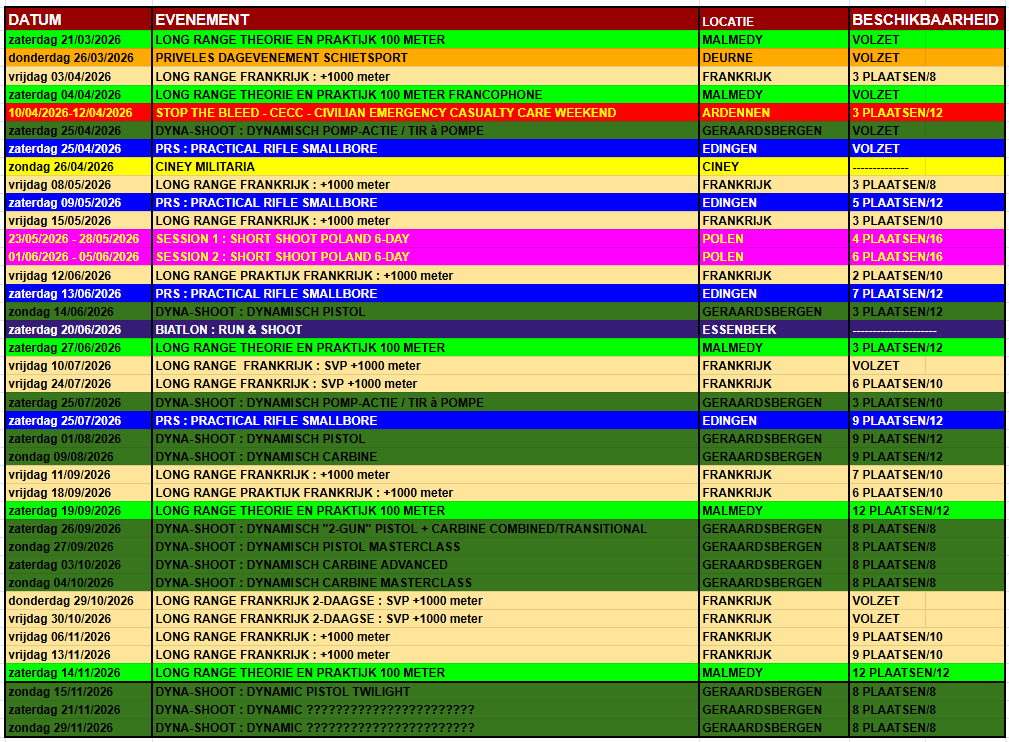 *Betaalde voorschotten/saldo's/facturen kunnen niet meer worden terugbetaald van een evenement/workshop die plaatsvind elders dan op een schietstand, van zodra deze werden voldaan, wegens het moeten weigeren van andere deelnemers bij een volle cursus.